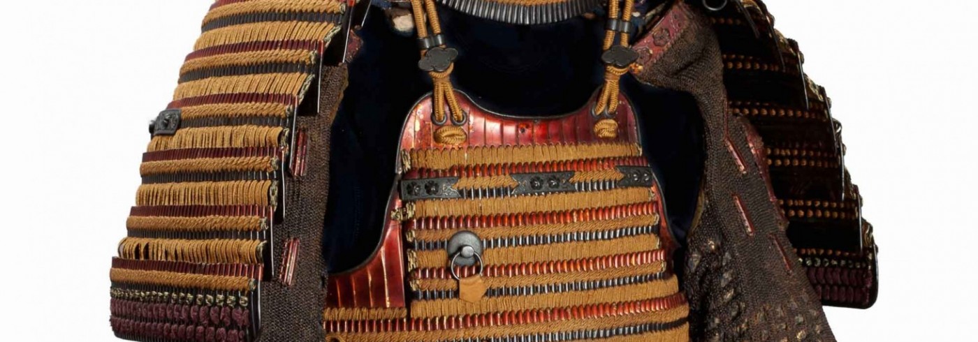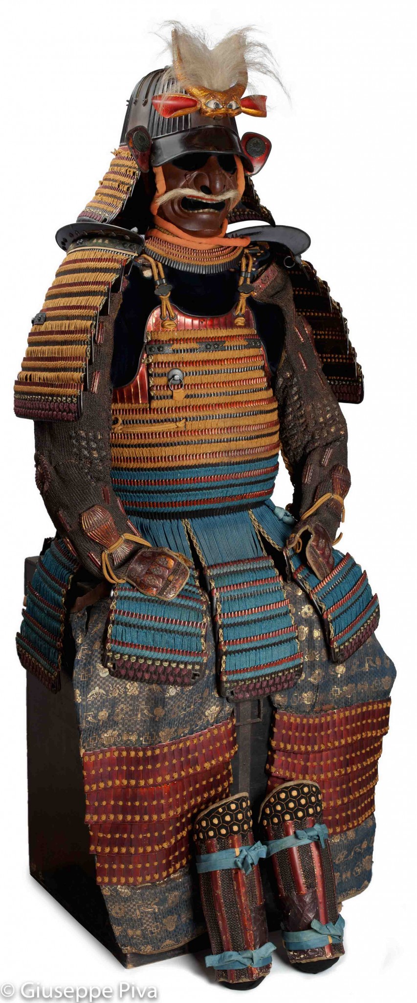 This particular lacquer is typical of Kaga’s armor-smiths, famous for their fine and richly decorated armors. Although the configuration of this samurai armor is manly classic, there are various elements typical of this region as the hart-shaped holes (inome, latterly boar’s eyes) and the quatrefoil-shaped buttons (mokko). The unusual haidate (tight guard) of kobakama type, to be worn as trousers, is also a feature linked with this style. The helmet is fitted with a very good original maedate representing the head of a shikami, demon of the Japanese tradition, lacquered in byakudan gold and probably belonged to the same region.